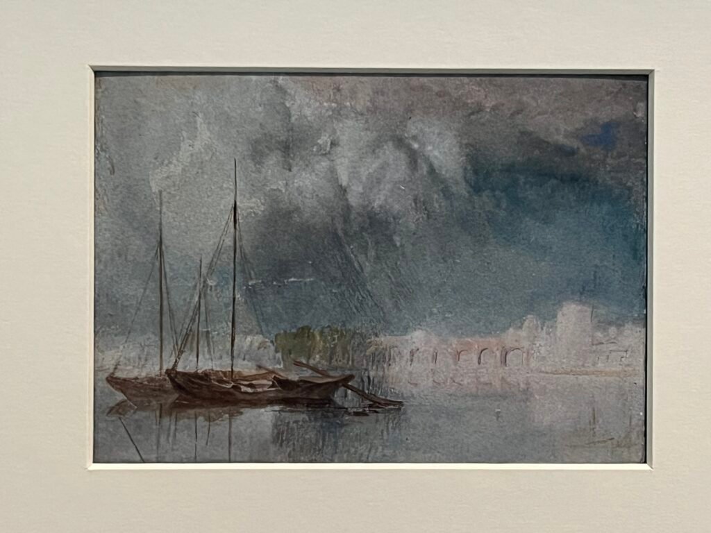 Le parcours offre au visiteur la possibilité de voir au sec les lieux qu’il se hâte de quitter quand il pleut, marchant courbé pour mieux se protéger du vent et de la pluie. La vue du Pont Pirmil à Nantes vers 1830 réalisée par Turner est à cet égard emblématique : nuages s’amoncelant au-dessus de la Loire et pluie qui chasse. L’averse localisée donne à voir le contraste entre la lumière vive et l’ombre qui s’installe sur le pont.